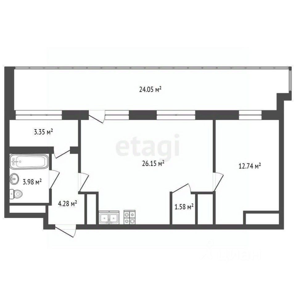 Однокомнатная квартира с террасой 24 кв.м., а также с остекленной в пол лоджией. Комфортная планировка с высококачественной отделкой от застройщика. На полу кварцвинил, обои под покраску -окрашивание возможно до 8 раз, потолки натяжные.