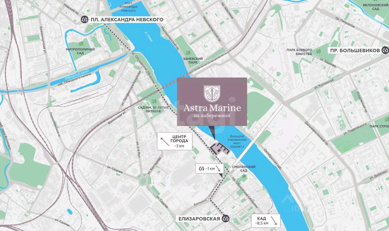 Astra Marine это жилой комплекс высокого комфорт-класса, расположенный в Невском районе, в пешей доступности от метро "Елизаровская" (10 минут)