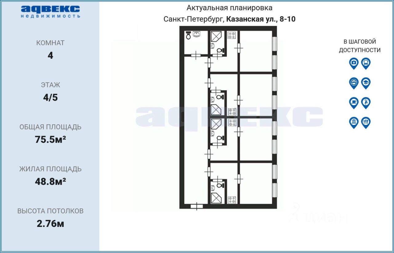 4-х комнатная квартира в 250 метрах от Казанского собора в пешей доступности до ст. м. Невский проспект (7 мин), Сенная пл. (10 мин), Спасская (11 мин). Дом - история, в котором жил и работал композитор Глазунов А.К., в окружении памятников архитектуры, магазинов и ресторанов.