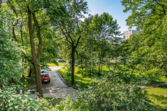 Очень много зелени, как во дворе так и в парках которыми окружен дом: