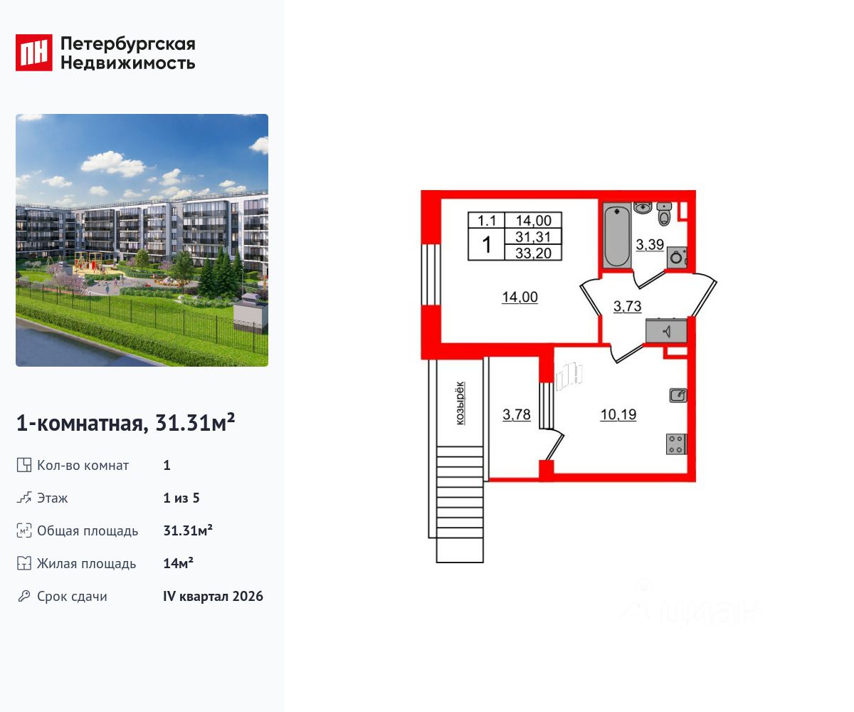Удобная, классическая планировка, кухня 10.19 м², вместительная прихожая 3.73 м². Общая площадь квартиры - 31.31 м², жилая 14 м², высота потолка 2.77 м.