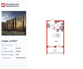 Удобная, классическая, функциональная европланировка, вместительная прихожая 2.87 м². Общая площадь студии - 24.49 м², жилая 18 м², высота потолка 3 м.