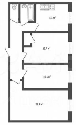 - Комнаты раздельные 18,9 м кв. + 12,7 м кв. + 10,3 м кв.