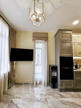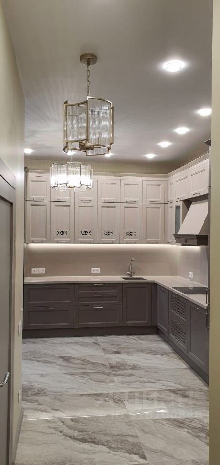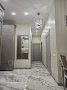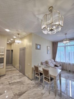 Отделка квартиры реализована высококачественными дорогостоящими материалами - в кухне гостиной, санузлах и гардеробной уложен итальянский керамогранит, в комнатах покрытие пола инженерная доска.