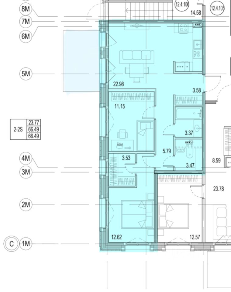 Планировка квартиры включает: кухню-гостиную с панорамными окнами площадью 22,98 м² с выходом на террасу 10м2 , две изолированные спальни, раздельный с/у и гардеробную с окном