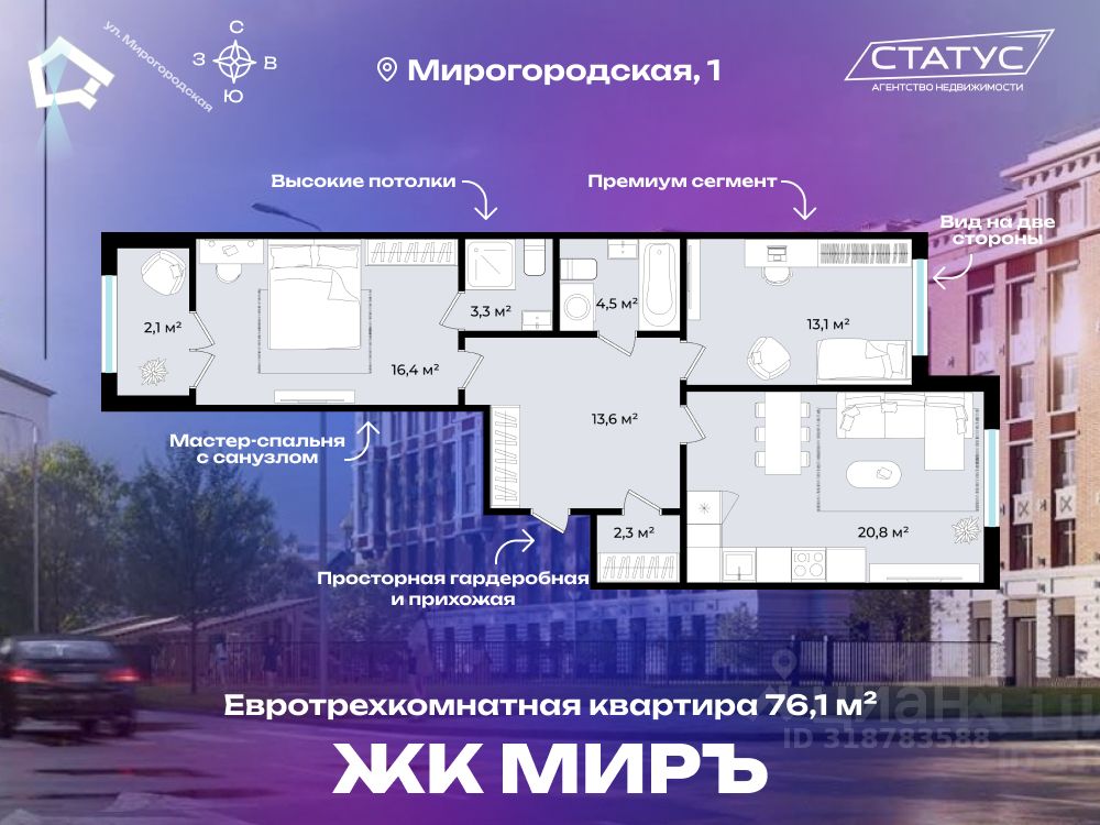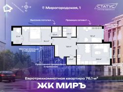 В продаже просторная евро-3 квартира в премиальном жилом комплексе Миръ.