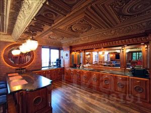 На первом этаже расположена гостиная без малого 70 кв.м с барно-кухонной зоной, в зеркальных стенах которой отражаются закаты над заливом, а также прихожая, скромные размеры которой удачно раздвинуты зеркалами, брутальный санузел в черно-золотых тонах.