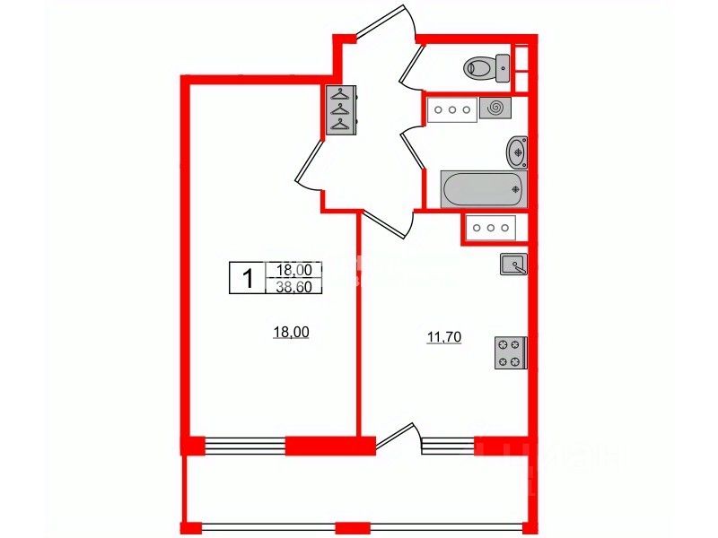 Площадь квартиры 38,6 кв. м без учета большой остекленной лоджии 7,5 кв. м., Большая комната 18 кв. м., кухня 11,7, просторная прихожая 5 кв. м., раздельный санузел. В квартире качественная отделка от Setl - Nord Line White. Высота потолков 2.7 м. Во всей квартире натяжные потолки.