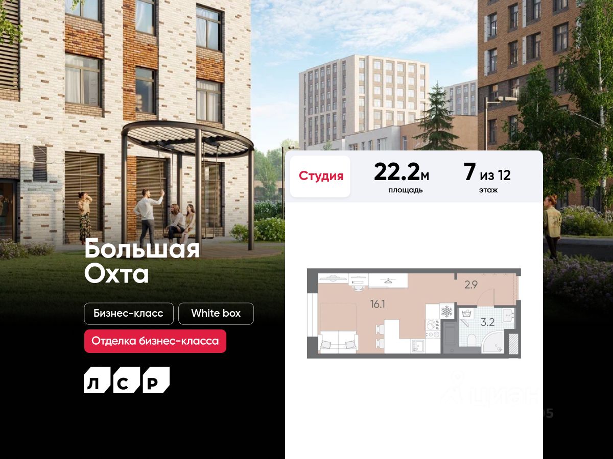 Продаётся студия в ЖК "Большая Охта" на 7 этаже. Общая площадь составляет 22.20 кв. м. Квартира с white box отделкой. Жилой комплекс "Большая Охта" располагается по адресу Санкт-Петербург, Красногвардейский.