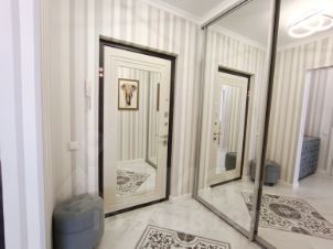 В квартире 1 изолированная спальня общей площадью 21 кв.м. с эркерным окном, что даёт больше света и пространства в комнате. Два коридора: из маленького мы попадаем в ванную комнату с санузлом и в спальню. В большом коридоре сделана вместительная гардеробная, которая скрыта раздвижными стеклянными дверьми, отдельно установлена стиральная машина.