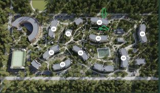 На территории комплекса: вело дорожки, медицинский центр, фитнес-центр с бассейном и SPA, бутик-отель с ресторанами, спортивные и детские площадки.