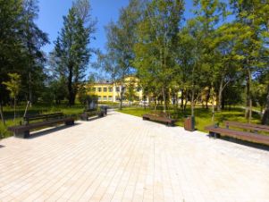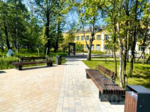 Уютный сквер с воинским мемориалом и природой для прогулок. Вдоль улочки есть скамейки и аллеи.