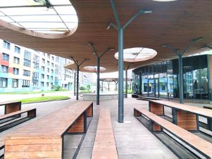 Дворы закрыты для въезда машин. Здесь устроены детские игровые площадки и зоны отдыха. В комплексе предусмотрена большая прогулочная зона с велосипедными и роликовыми дорожками. Свой детский сад. Есть собственный кинотеатр Юность и целая торговая улица. Также есть наземный многоуровневый паркинг.