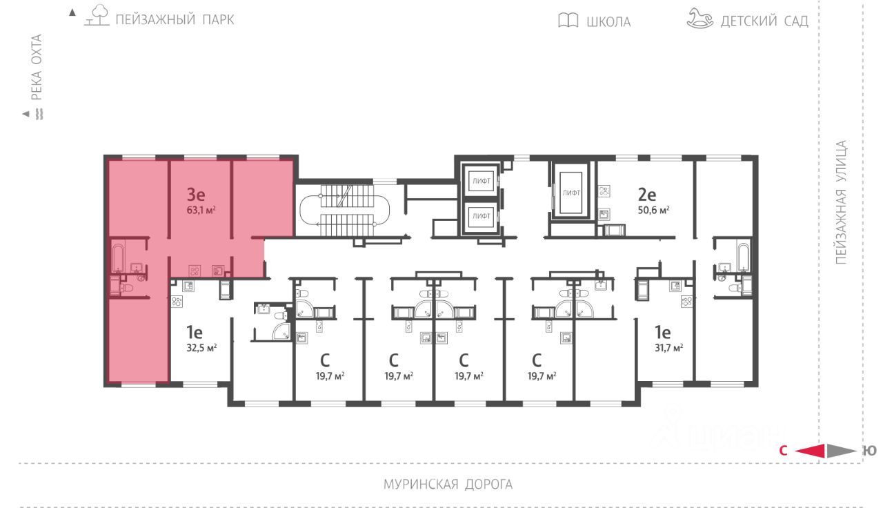 Вдоль леса и рядом с рекой Охта. К 2026 году на берегах реки Охты будет создан Пейзажный парк с летними экотропами и зимними горками для тюбингов, скейт-парком и летним кинотеатром.