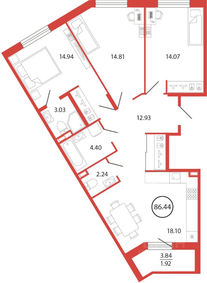 Продаётся e4 комнатная квартира (евро) в жилищном комплексе "Энфилд" (корпус Дом 18 секция 2). Общая площадь 86,44 кв. м, площадь комнат 14,94 кв.м, 14,81 кв.м, 14,07 кв.м. 2 санузла. Квартира расположена на 2 этаже 12 этажного дома. Срок сдачи корпуса IV квартал 2027 года.