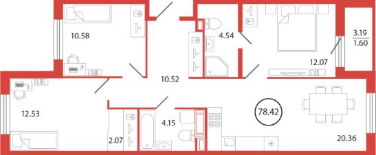 Продаётся e4 комнатная квартира (евро) в жилищном комплексе "Энфилд" (корпус Дом 18 секция 6). Общая площадь 78,42 кв. м, площадь комнат 12,53 кв.м, 10,58 кв.м, 12,07 кв.м. 2 санузла. Квартира расположена на 5 этаже 12 этажного дома. Срок сдачи корпуса IV квартал 2027 года.