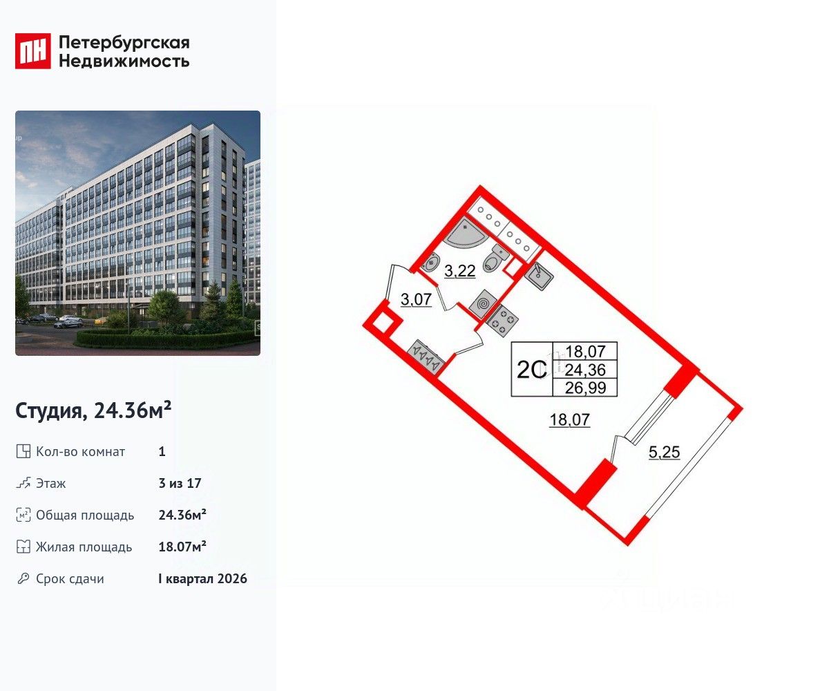 Удобная, классическая, функциональная европланировка, вместительная прихожая 3.07 м². Общая площадь студии - 24.36 м², жилая 18.07 м², высота потолка 2.77 м.