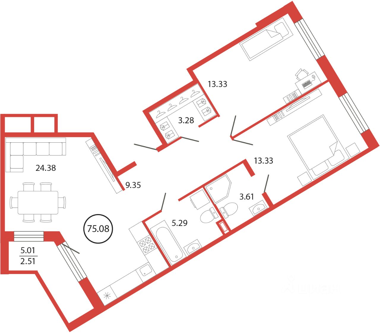 Продаётся e3 комнатная квартира (евро) в жилищном комплексе "Энфилд" (корпус Дом 18 секция 4). Общая площадь 75,08 кв. м, площадь комнат 13,33 кв.м, 13,33 кв.м. 2 санузла. Квартира расположена на 2 этаже 12 этажного дома. Срок сдачи корпуса IV квартал 2027 года.