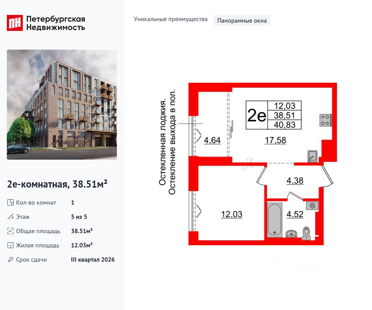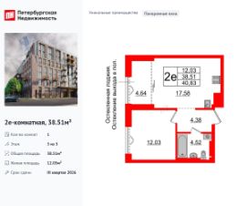 Уникальная, функциональная европланировка, большая кухня-гостиная 17.58 м², просторная прихожая 4.38 м². Общая площадь квартиры - 38.51 м², жилая  12.03 м².
