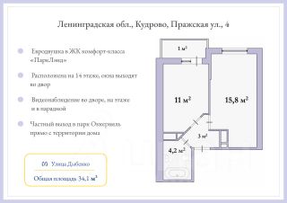 * Общая площадь — 34,1 кв.м, жилая — 11 кв.м., просторная кухня-гостиная — 15,8 кв.м.