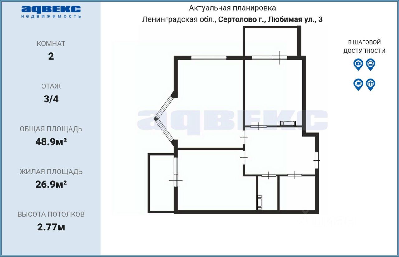 Просторная жилая площадь составляет 26,9 квадратных метров, кухня занимает 9 квадратных метров.