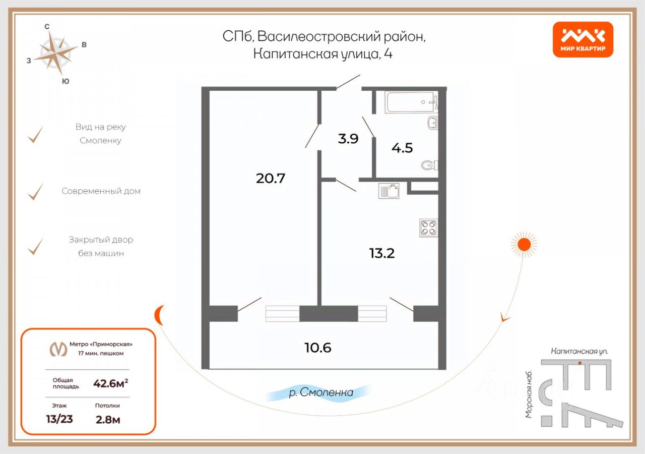 В непосредственной близости от дома прекрасная благоустроенная набережная реки Смоленки, а так же недавно открывшийся Линейный парк с детскими игровыми площадками и местами для отдыха, где можно наблюдать потрясающе красивые закаты. До нового парка можно дойти за пару минут, а прямо рядом с домом проходит прогулочная зона.