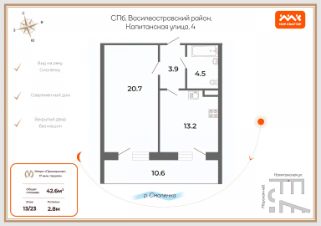 Арт. 107469246 В продаже комфортная светлая квартира площадью 42,6 метра. Рациональная планировка квартиры: комната 20,7 метров и кухня 13,1.
