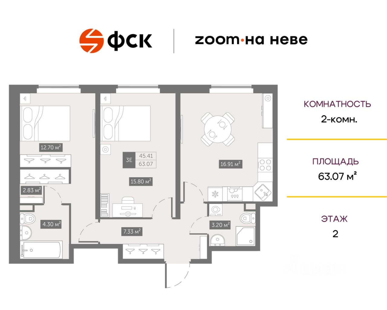 Цена со скидкой до 30% в прямой продаже от застройщика — только в этом месяце. При покупке апартаментов - паркинг за полцены. На все апартаменты действует беспроцентная рассрочка. Купите на распродаже! Покупка недвижимости в Zoom на Неве сейчас со скидкой до 30% позволит через 2 года получить доход до 6 300 000 руб. Роскошные виды на Неву. 2-к апартамент в комплексе класса бизнес-лайт Zoom на Неве на 2-м этаже. Общая площадь 63,07. Без отделки.