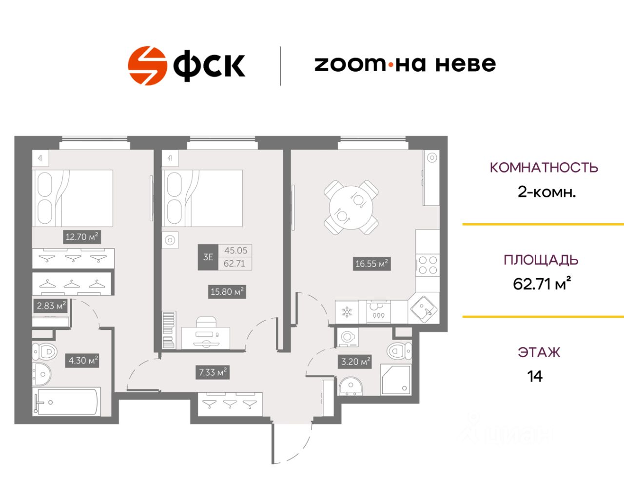 Цена со скидкой до 30% в прямой продаже от застройщика — только в этом месяце. При покупке апартаментов - паркинг за полцены. На все апартаменты действует беспроцентная рассрочка. Купите на распродаже! Покупка недвижимости в Zoom на Неве сейчас со скидкой до 30% позволит через 2 года получить доход до 6 300 000 руб. Роскошные виды на Неву. 2-к апартамент в комплексе класса бизнес-лайт Zoom на Неве на 14-м этаже. Общая площадь 62,71. Без отделки.
