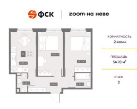 Цена со скидкой до 30% в прямой продаже от застройщика — только в этом месяце. При покупке апартаментов - паркинг за полцены. На все апартаменты действует беспроцентная рассрочка. Купите на распродаже! Покупка недвижимости в Zoom на Неве сейчас со скидкой до 30% позволит через 2 года получить доход до 6 300 000 руб. Роскошные виды на Неву. 2-к апартамент в комплексе класса бизнес-лайт Zoom на Неве на 2-м этаже. Общая площадь 54,78. Без отделки.