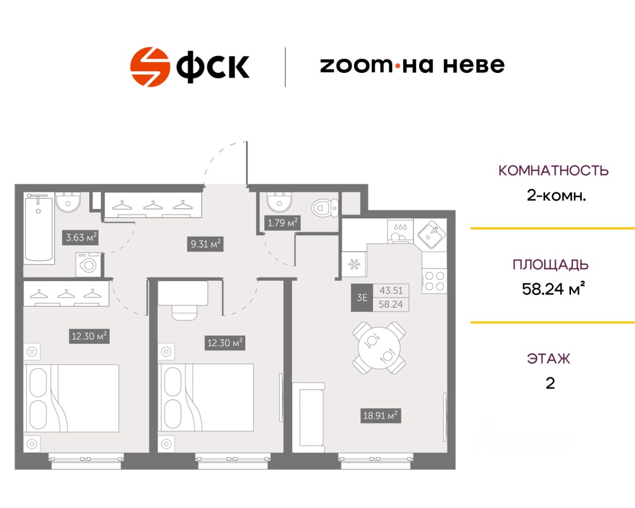 Цена со скидкой до 30% в прямой продаже от застройщика — только в этом месяце. При покупке апартаментов - паркинг за полцены. На все апартаменты действует беспроцентная рассрочка. Купите на распродаже! Покупка недвижимости в Zoom на Неве сейчас со скидкой до 30% позволит через 2 года получить доход до 6 300 000 руб. Роскошные виды на Неву. 2-к апартамент в комплексе класса бизнес-лайт Zoom на Неве на 2-м этаже. Общая площадь 58,24. Без отделки.