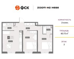 Цена со скидкой до 30% в прямой продаже от застройщика — только в этом месяце. При покупке апартаментов - паркинг за полцены. На все апартаменты действует беспроцентная рассрочка. Купите на распродаже! Покупка недвижимости в Zoom на Неве сейчас со скидкой до 30% позволит через 2 года получить доход до 6 300 000 руб. Роскошные виды на Неву. 2-к апартамент в комплексе класса бизнес-лайт Zoom на Неве на 2-м этаже. Общая площадь 60,73. Без отделки.