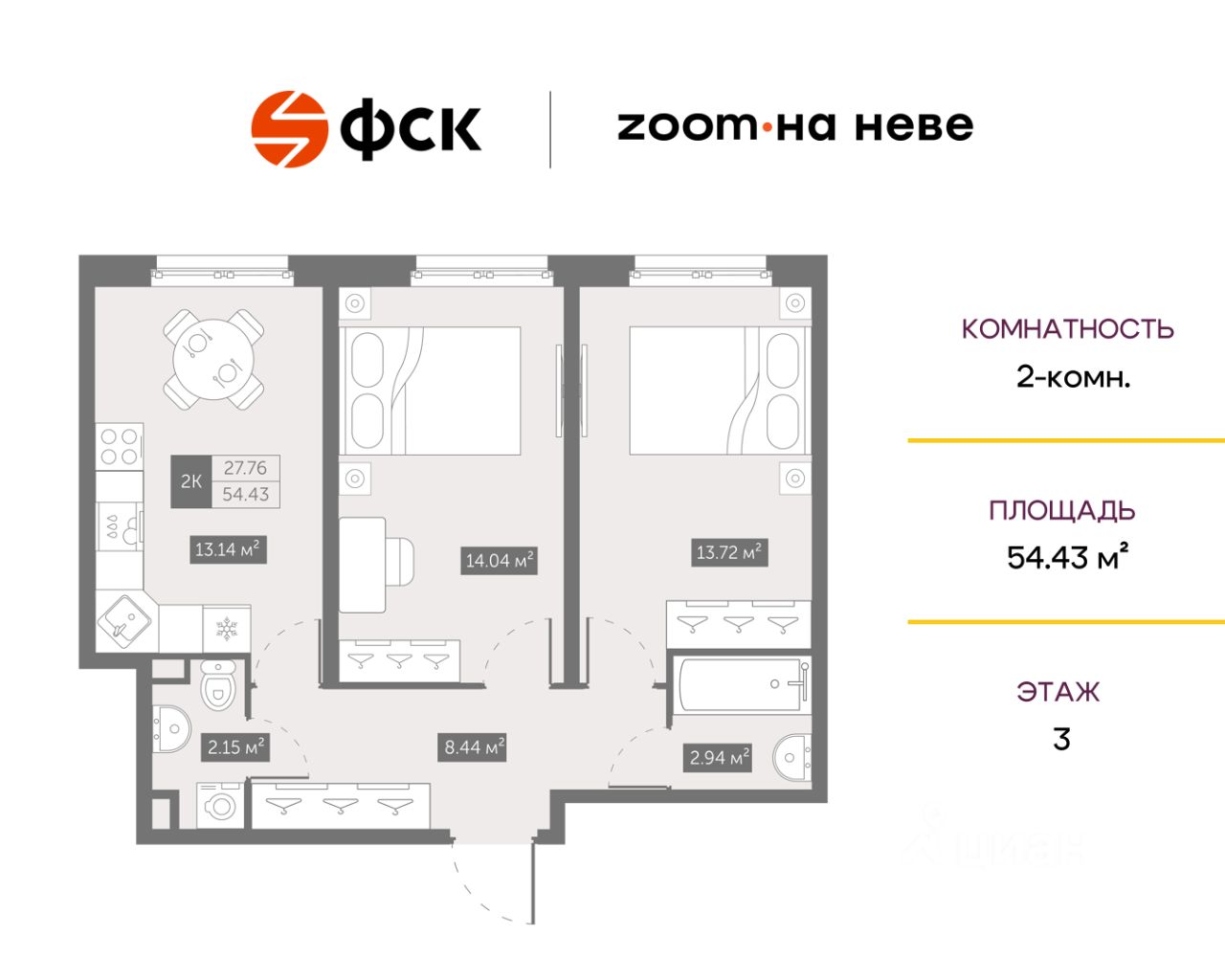 Цена со скидкой до 30% в прямой продаже от застройщика — только в этом месяце. При покупке апартаментов - паркинг за полцены. На все апартаменты действует беспроцентная рассрочка. Купите на распродаже! Покупка недвижимости в Zoom на Неве сейчас со скидкой до 30% позволит через 2 года получить доход до 6 300 000 руб. Роскошные виды на Неву. 2-к апартамент в комплексе класса бизнес-лайт Zoom на Неве на 3-м этаже. Общая площадь 54,43. Без отделки.