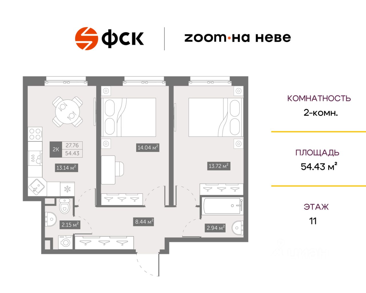 Цена со скидкой до 30% в прямой продаже от застройщика — только в этом месяце. При покупке апартаментов - паркинг за полцены. На все апартаменты действует беспроцентная рассрочка. Купите на распродаже! Покупка недвижимости в Zoom на Неве сейчас со скидкой до 30% позволит через 2 года получить доход до 6 300 000 руб. Роскошные виды на Неву. 2-к апартамент в комплексе класса бизнес-лайт Zoom на Неве на 11-м этаже. Общая площадь 54,43. Без отделки.
