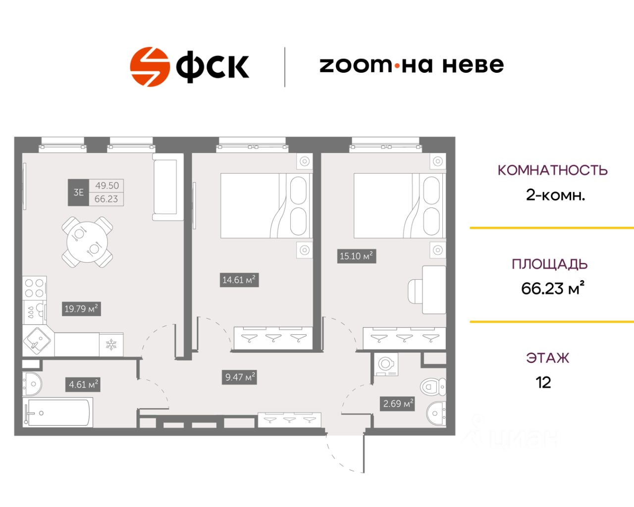 Цена со скидкой до 30% в прямой продаже от застройщика — только в этом месяце. При покупке апартаментов - паркинг за полцены. На все апартаменты действует беспроцентная рассрочка. Купите на распродаже! Покупка недвижимости в Zoom на Неве сейчас со скидкой до 30% позволит через 2 года получить доход до 6 300 000 руб. Роскошные виды на Неву. 2-к апартамент в комплексе класса бизнес-лайт Zoom на Неве на 12-м этаже. Общая площадь 66,23. Без отделки.