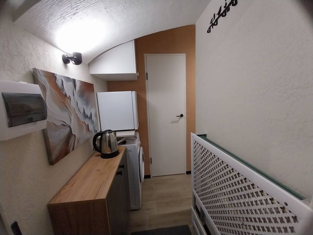 Новая мебель, удобный современный диван, небольшой столик и два табурета, шкафчик, телевизор, микроволновка, стиральная машина, сушилка для белья, бойлер на случай отключения воды, холодильник, фен, утюг, чайник, WI FI, кухонный стол с индукционной плитой на две конфорки и раковиной, небольшой набор новой посуды.