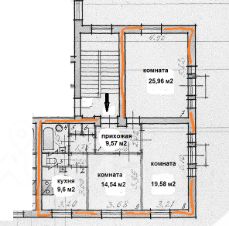 Общая площадь квартиры составляет 85.7 кв. м, Площадь комнат- 14,54+19,58+25,96 м2 , площадь кухни — 9.6 кв. м. Высота потолков-3,24 м