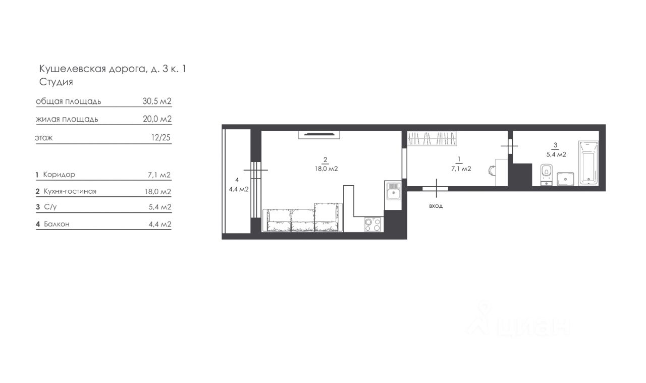 Планировка: большая кухня-гостиная с раскладным диваном и выходом на балкон, коридор, в котором оборудовано рабочее место и совмещенная ванная комната.