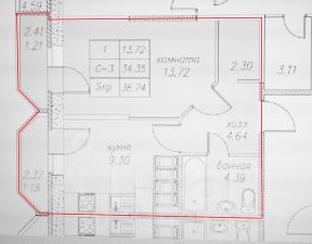 Комната 13,7кв.м., кухня 9,3кв.м, санузел 4,39кв.м., гардеробная 2,3кв.м., балконы 2,37 и 2,41кв.м.