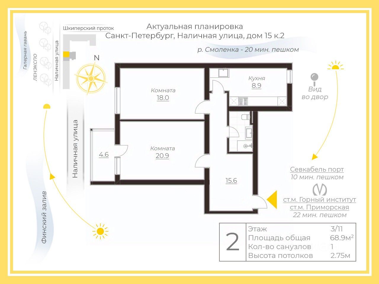 Общая площадь — 68,9 м², удачная планировка: две изолированные комнаты и просторная кухня