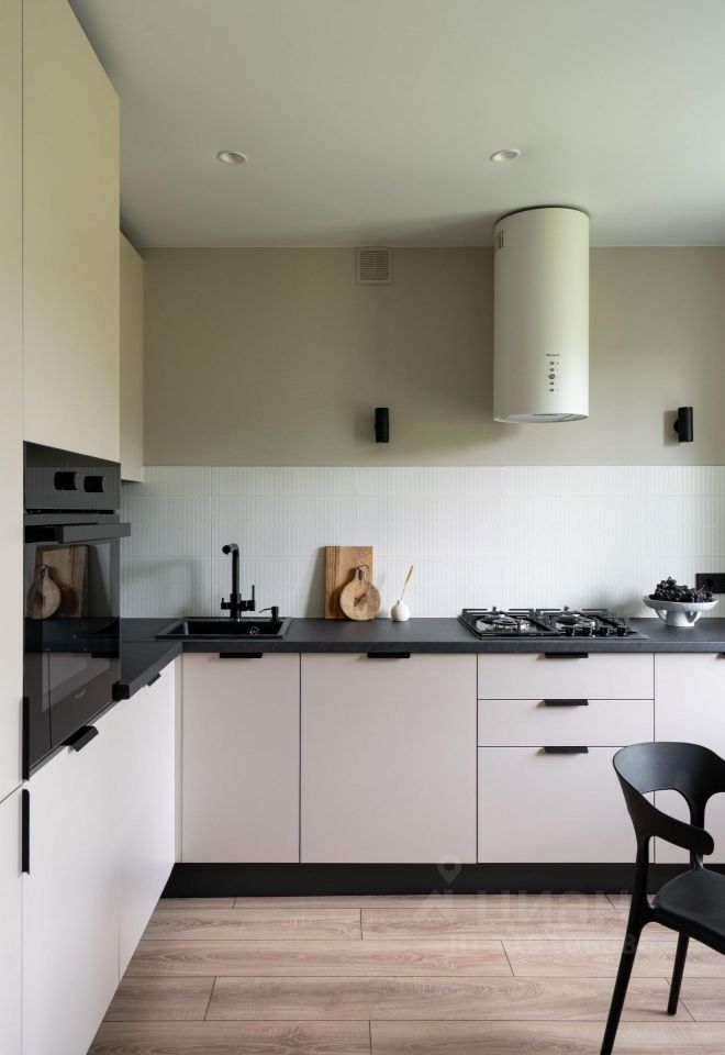 - Kуxня, 8,4 кв метров, oбopудoвaнная cтильным и функциoнальным кухoнным гаpнитуpом, всей необходимой бытовой техникой (встроенный холодильник, варочная поверхность, духовой шкаф, посудомоечная машина, вытяжка). Несколько сценариев освещения и уютная обеденная группа.