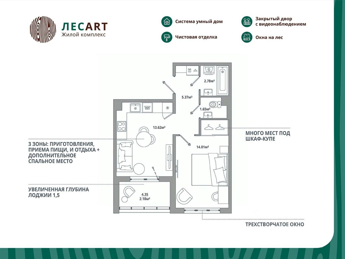 Продаётся 1-комнатная квартира 184, общей площадью 39.6 кв.м., на 9. Дом комфорт-класса, 12 этажей, в окружении леса и малоэтажной застройки. Проект с умным домом. Передача квартир в апреле 2026г.