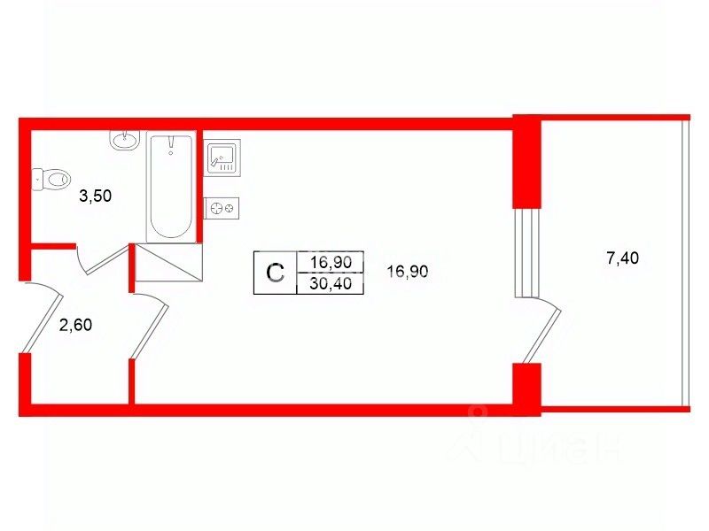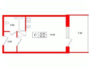 Общая площадь 23 м. кв., из них: комната 16,9 м. кв., прихожая 2,6 м кв, санузел 3,5 м кв. Дополнительно просторная лоджия 7,4 м кв.