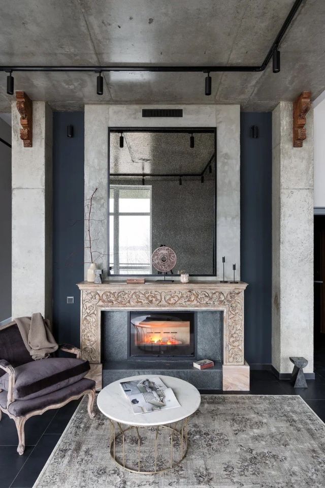 * кухня-гостиная с панорамными окнами, высокими потолками 5 кв.м и действующим камином
