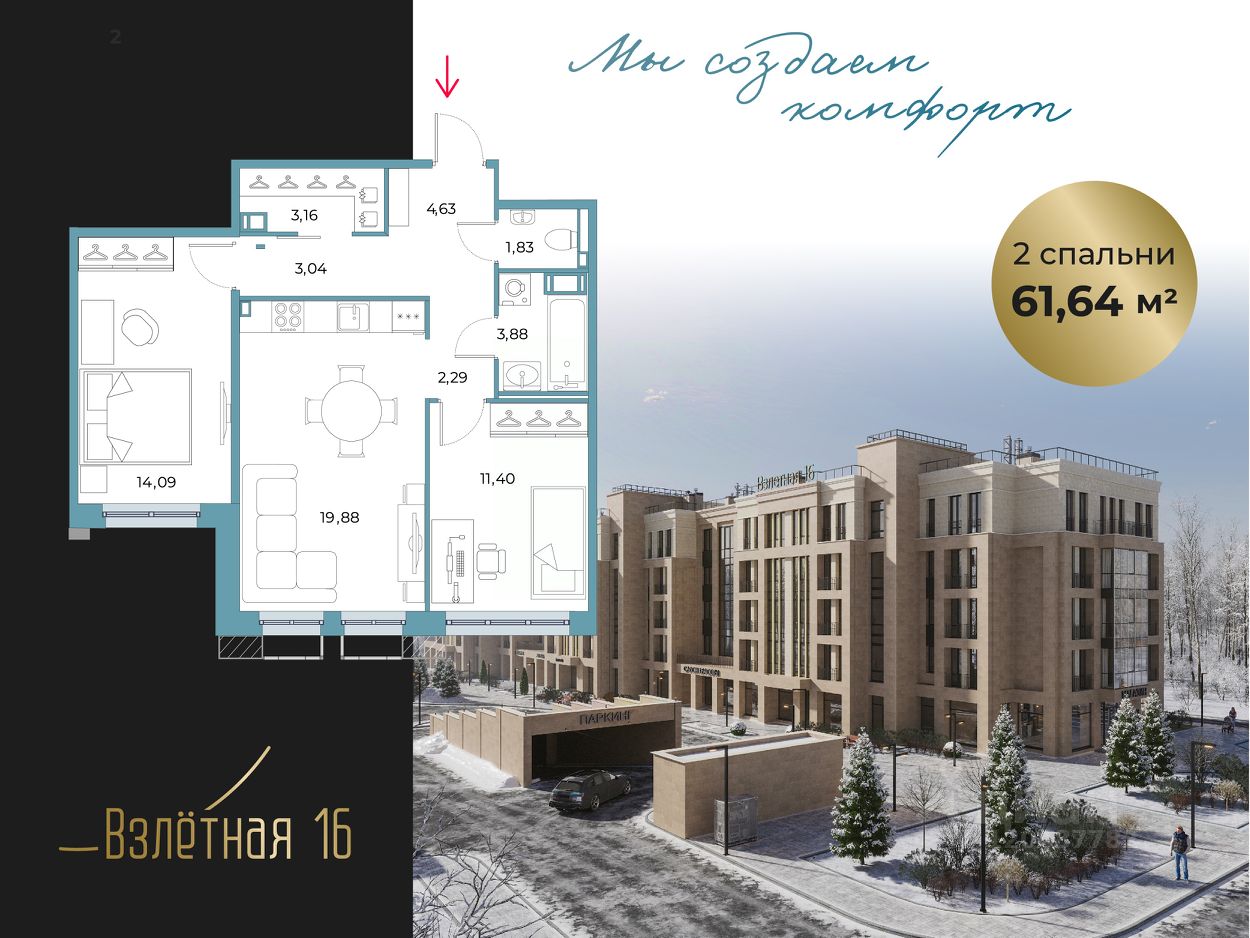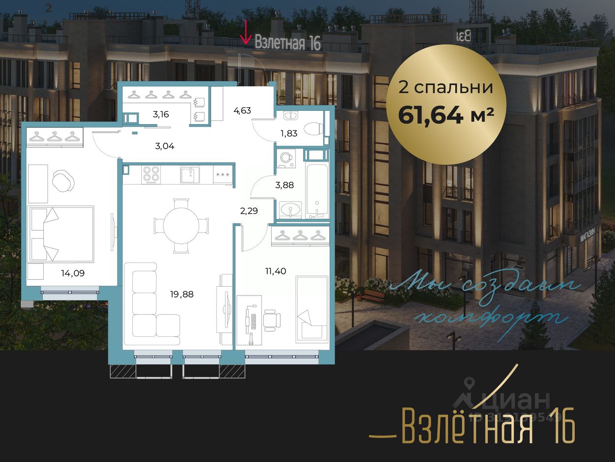 Общая площадь квартиры составляет 61,64 м2, из которых 19,88 м2 отведено под просторную кухню-гостиную с тремя окнами. Спальня 14,09 м2 с выходом на террасу, раздельный сан.узел. Предусмотрена гардеробная.