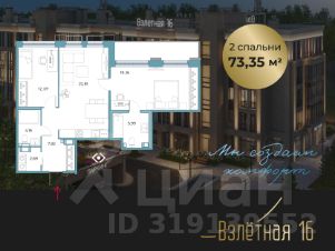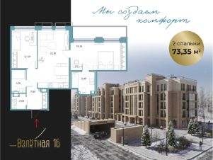 Общая площадь квартиры составляет 73,35 м2, из которых 22,81 м2 отведено под просторную кухню-гостиную с двумя окнами. Мастер спальня 19,16 м2 с собственным сан.узлом и выделенным рабочим местом. Отдельным помещением под прачечную.