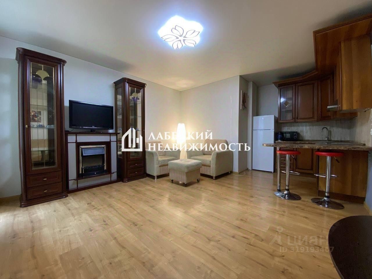 — Натяжные потолки (2,7 м), кухня (5 м²) из натурального дерева, широкая барная стойка с барными стульями.
