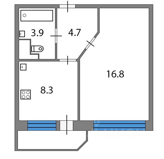 Площадь квартиры составляет 33,6 кв. м + лоджия 2,5 кв.м, жилая площадь — 16.8 кв. м, кухня — 8.3 кв. м. Высота потолков — 2.75 метра, что создает просторное и светлое пространство. Планировка удобная для организации комфортного зонирования. Коридор, в котором свободно можно разместить шкаф для верхней одежды, выделенное спальное место в комнате, квадратная кухня, просторная ванная комната, застекленная лоджия. В квартире требуется ремонт, что учтено в стоимости.