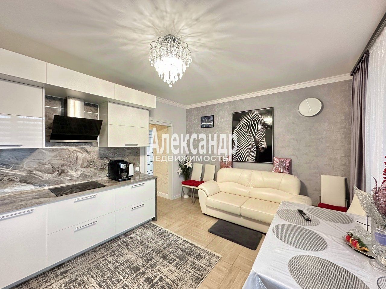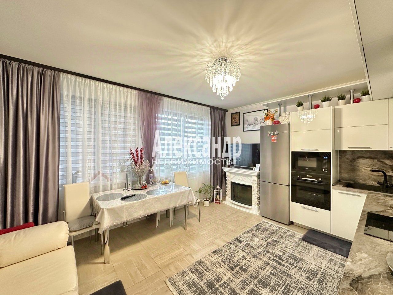 В квартире 5 окон, большая кухня-гостинная 19 м.кв. с двумя окнами, спальня с балконом и окном 15,7 м.кв., вторая спальня 11 м.кв., два санузла - один с душевой 3,7 м.кв., второй с ванной 3,5 м.кв., большая прихожая 7,7 м.кв. с встроенным шкафом-купе, шикарный кухонный гарнитур -остается в подарок новым владельцам!