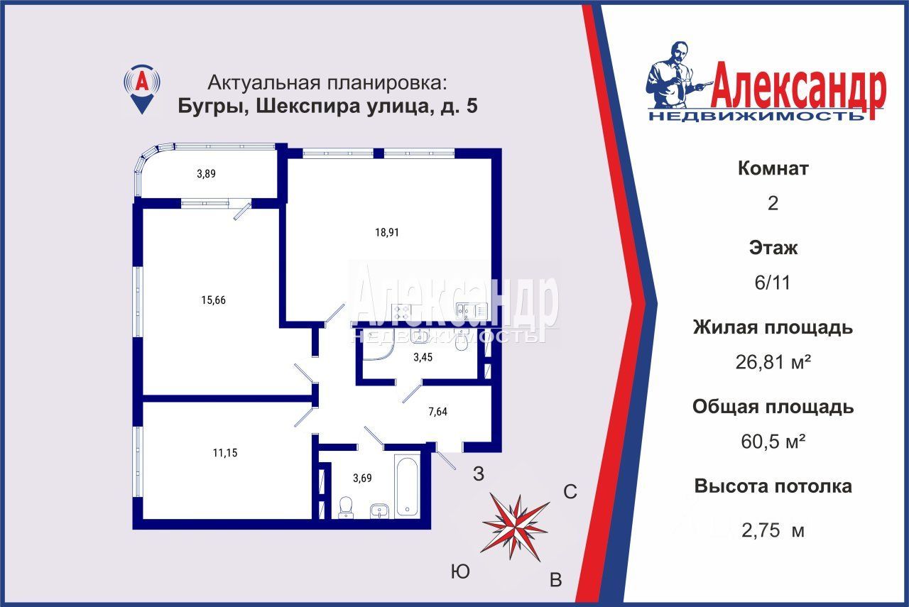 1703727 Продаётся просторная 3к-евро квартира 62.9 м² в ЖК Энфилд на шестом этаже двенадцатиэтажного дома комфорт-класса, в идеальном состоянии с улучшенной планировкой.